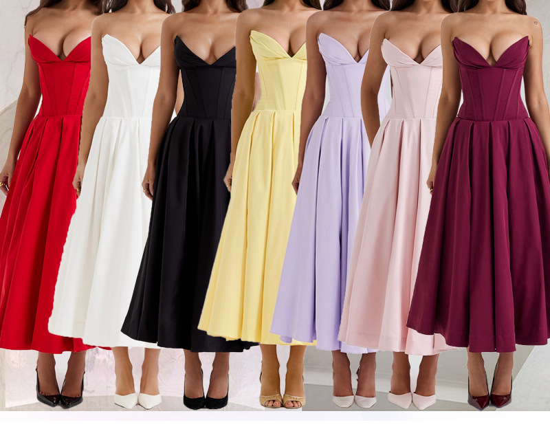 Product Introduction: This spring – designed women’s dress is a paragon of style and allure. The sleeveless and strapless design accentuates the feminine shoulders and collarbone, exuding an irresistible sexy charm. Its mid – length cut strikes the perfect balance between elegance and playfulness, making it suitable for various occasions, from a casual brunch to a trendy evening soiree. Material Advantage: Crafted from high – quality, lightweight fabric, the dress offers a soft and comfortable touch against the skin. It drapes gracefully, following the body’s curves in a flattering way. The fabric also has excellent breathability, ensuring you stay cool and fresh even on warmer spring days. Design Highlights: The solid – color concept provides a timeless and sophisticated look. It’s easy to accessorize, allowing you to add your personal touch with statement jewelry, a stylish handbag, or trendy shoes. The strapless top features a well – designed elastic band, ensuring a secure fit without sacrificing comfort. And the mid – length hemline not only shows off your legs in a tasteful manner but also gives a sense of mobility, enabling you to move freely.